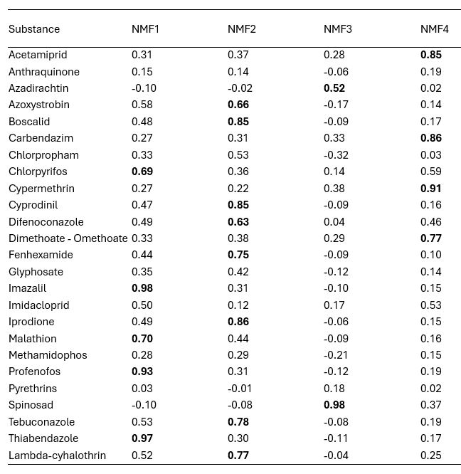 Πίνακας 1: Εμφάνιση μεμονωμένων δραστικών συστατικών φυτοφαρμάκων στις ομάδες NMF (συσχετίσεις για 32.062 σύνολα δεδομένων)