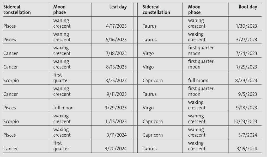Πίνακας. 2: Τα πειράματα κυτταροκαλλιέργειας ξεκίνησαν στις «ημέρες φύλλων» και στις «ημέρες ριζών». Χρησιμοποιήσαμε τα δεδομένα που δίνονται στο ημερολόγιο Stella Natura του 2023 και 2024. Σημειώσαμε επίσης τη φάση της Σελήνης (17, 18).