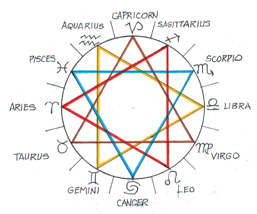 Σχήμα 1 : Αστρικοί/ζωδιακοί αστερισμοί με τα στοιχεία με τα οποία συνδέονται: «γη» – καφέ (Ταύρος, Αιγόκερως, Παρθένος)- “νερό” – μπλε (Καρκίνος, Σκορπιός, Ιχθείς)- “αέρας” – κίτρινο (Δίδυμοι, Ζυγός, Υδροχόος)- “ζεστασιά” – κόκκινο (Λέων, Κριός, Τοξότης).